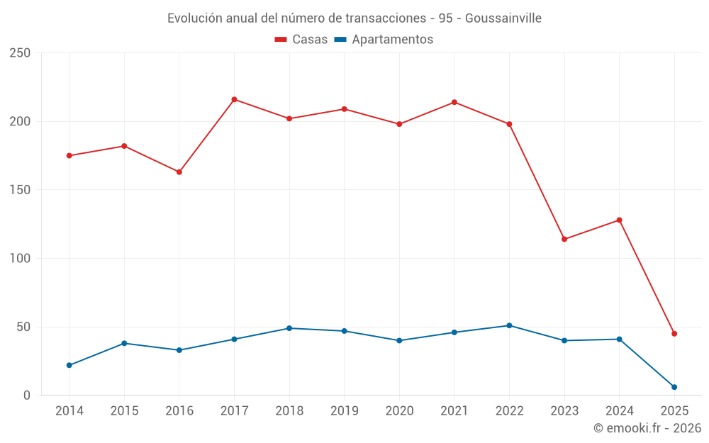 El precio mediano en las 20 transacciones de casas de los últimos 3 meses en la comuna de Goussainville fue de 3 241 € por metro cuadrado para un valor patrimonial medio de 251 000 €. Durante este período el 60% de las transacciones estuvieron entre 2 755 y 4 063 € por metro cuadrado (del 2º al 8º decil).