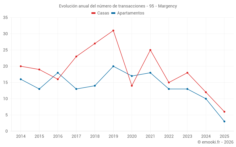 El precio mediano en las 23 transacciones de apartamentos de los últimos 24 meses en la comuna de Margency fue de 3 726 € por metro cuadrado para un valor patrimonial medio de 251 460 €. Durante este período el 60% de las transacciones estuvieron entre 3 405 y 4 317 € por metro cuadrado (del 2º al 8º decil).