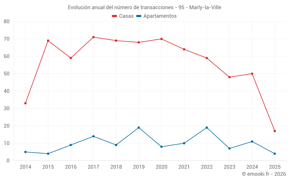 El precio mediano en las 17 transacciones de apartamentos de los últimos 24 meses en la comuna de Marly-la-Ville fue de 3 117 € por metro cuadrado para un valor patrimonial medio de 150 000 €. Durante este período el 60% de las transacciones estuvieron entre 2 525 y 3 967 € por metro cuadrado (del 2º al 8º decil).