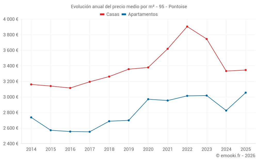 El precio mediano en las 43 transacciones de apartamentos de los últimos 3 meses en la comuna de Pontoise fue de 3 053 € por metro cuadrado para un valor patrimonial medio de 171 000 €. Durante este período el 60% de las transacciones estuvieron entre 2 346 y 3 687 € por metro cuadrado (del 2º al 8º decil).