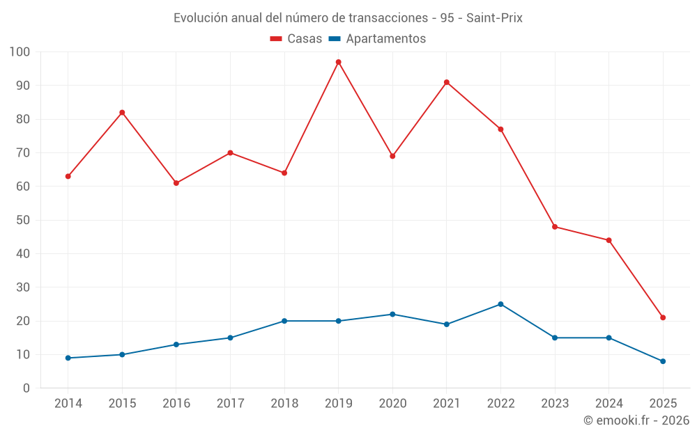 El precio mediano en las 21 transacciones de casas de los últimos 6 meses en la comuna de Saint-Prix fue de 3 846 € por metro cuadrado para un valor patrimonial medio de 405 350 €. Durante este período el 60% de las transacciones estuvieron entre 3 398 y 4 350 € por metro cuadrado (del 2º al 8º decil).