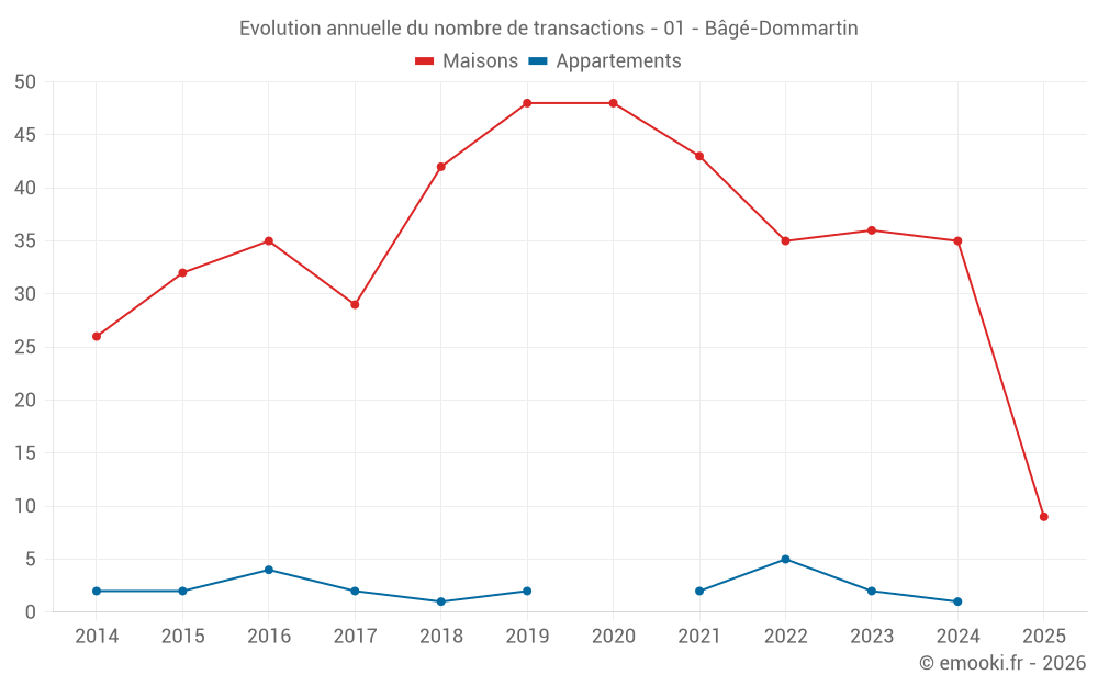 Le prix médian sur les 29 transactions de maisons des 12 derniers mois dans la commune de Bâgé-Dommartin était de 2 088 € par mètre carré pour une valeur foncière médiane de 214 490 €. Sur cette période 60% des transactions se sont situées entre 1 335 et 2 574 € par mètre carré (du 2ème au 8ème déciles).