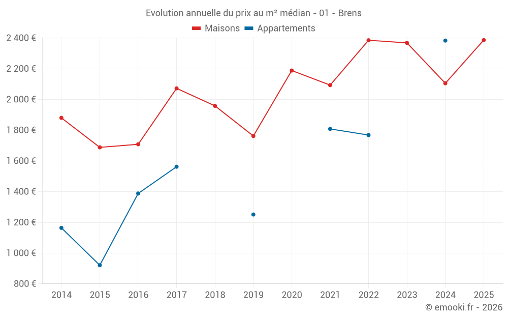 Le prix médian sur les 15 transactions de maisons des 24 derniers mois dans la commune de Brens était de 2 143 € par mètre carré pour une valeur foncière médiane de 310 000 €. Sur cette période 60% des transactions se sont situées entre 1 276 et 2 862 € par mètre carré (du 2ème au 8ème déciles).