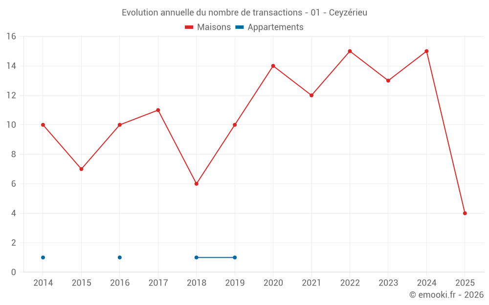 Le prix médian sur les 24 transactions de maisons des 24 derniers mois dans la commune de Ceyzérieu était de 2 166 € par mètre carré pour une valeur foncière médiane de 177 500 €. Sur cette période 60% des transactions se sont situées entre 1 454 et 3 006 € par mètre carré (du 2ème au 8ème déciles).