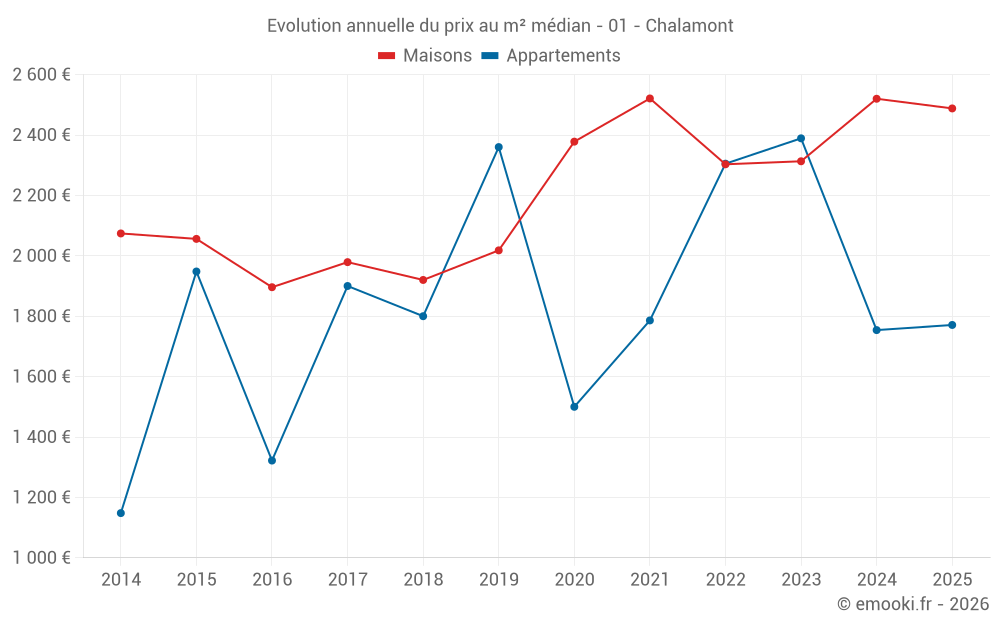 Le prix médian sur les 23 transactions de maisons des 12 derniers mois dans la commune de Chalamont était de 2 590 € par mètre carré pour une valeur foncière médiane de 260 000 €. Sur cette période 60% des transactions se sont situées entre 1 850 et 3 079 € par mètre carré (du 2ème au 8ème déciles).