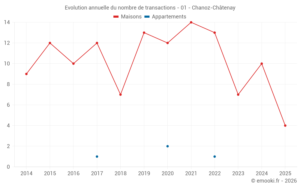 Le prix médian sur les 18 transactions de maisons des 24 derniers mois dans la commune de Chanoz-Châtenay était de 2 390 € par mètre carré pour une valeur foncière médiane de 265 000 €. Sur cette période 60% des transactions se sont situées entre 2 085 et 2 759 € par mètre carré (du 2ème au 8ème déciles).