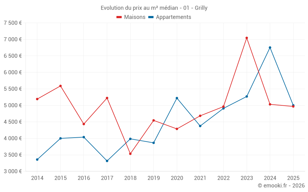 Le prix médian sur les 15 transactions de maisons des 24 derniers mois dans la commune de Grilly était de 5 159 € par mètre carré pour une valeur foncière médiane de 654 102 €. Sur cette période 60% des transactions se sont situées entre 4 268 et 6 834 € par mètre carré (du 2ème au 8ème déciles).