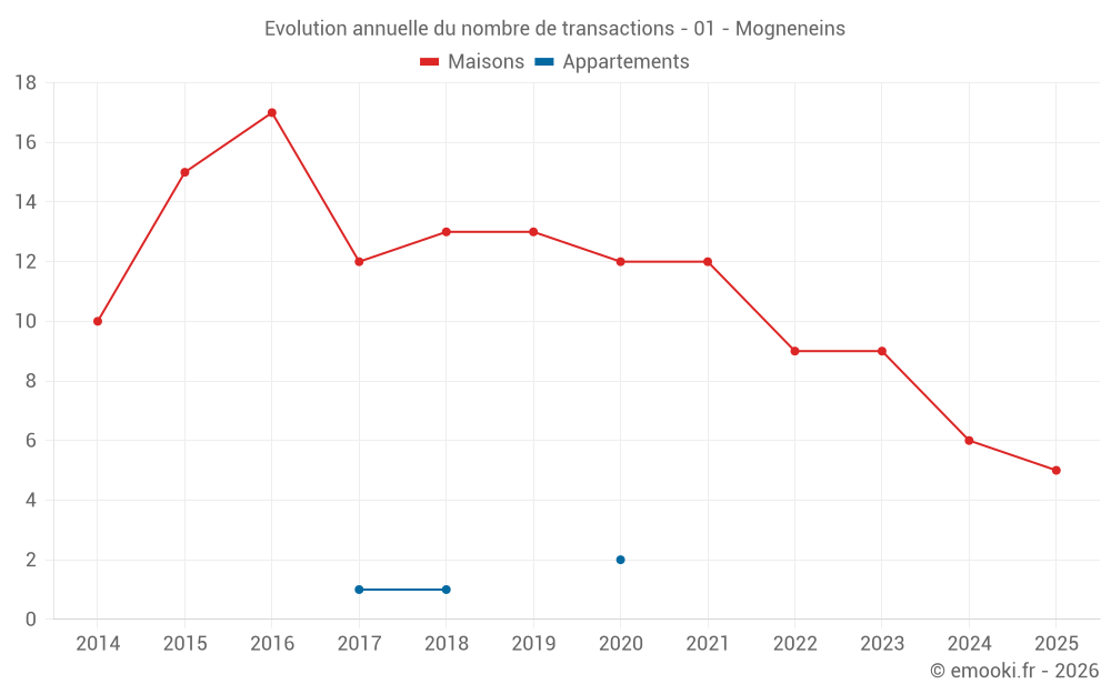 Le prix médian sur les 17 transactions de maisons des 24 derniers mois dans la commune de Mogneneins était de 2 882 € par mètre carré pour une valeur foncière médiane de 287 000 €. Sur cette période 60% des transactions se sont situées entre 2 280 et 3 168 € par mètre carré (du 2ème au 8ème déciles).