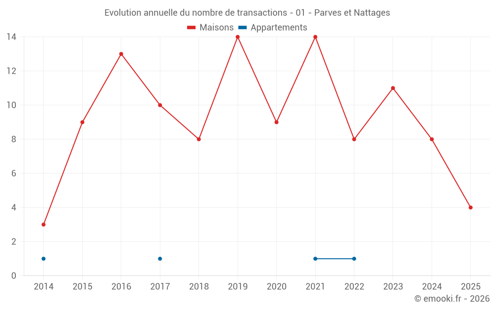 Le prix médian sur les 18 transactions de maisons des 24 derniers mois dans la commune de Parves et Nattages était de 2 451 € par mètre carré pour une valeur foncière médiane de 315 865 €. Sur cette période 60% des transactions se sont situées entre 1 807 et 3 427 € par mètre carré (du 2ème au 8ème déciles).