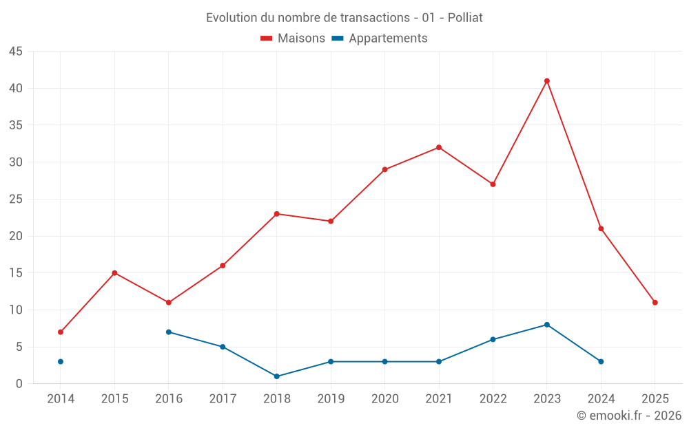Le prix médian sur les 25 transactions de maisons des 12 derniers mois dans la commune de Polliat était de 2 357 € par mètre carré pour une valeur foncière médiane de 290 231 €. Sur cette période 60% des transactions se sont situées entre 1 909 et 2 800 € par mètre carré (du 2ème au 8ème déciles).