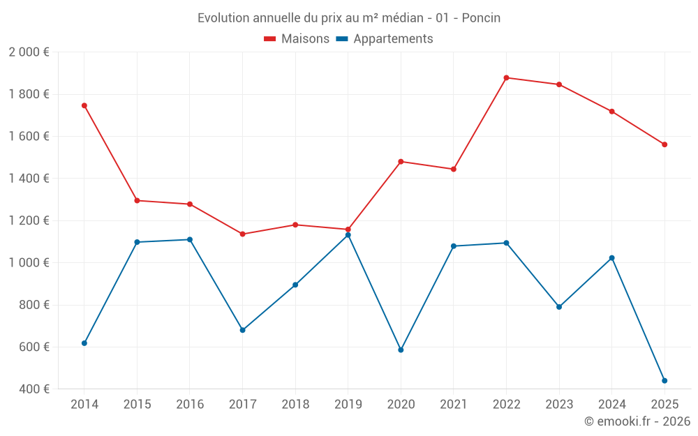 Le prix médian sur les 32 transactions de maisons des 24 derniers mois dans la commune de Poncin était de 1 784 € par mètre carré pour une valeur foncière médiane de 152 500 €. Sur cette période 60% des transactions se sont situées entre 1 269 et 2 530 € par mètre carré (du 2ème au 8ème déciles).