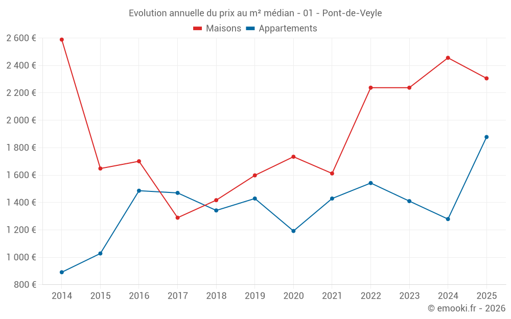 Le prix médian sur les 14 transactions de maisons des 24 derniers mois dans la commune de Pont-de-Veyle était de 2 317 € par mètre carré pour une valeur foncière médiane de 232 500 €. Sur cette période 60% des transactions se sont situées entre 1 840 et 2 797 € par mètre carré (du 2ème au 8ème déciles).