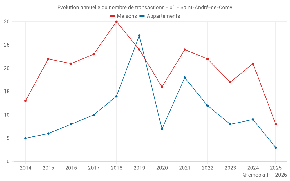 Le prix médian sur les 23 transactions de maisons des 12 derniers mois dans la commune de Saint-André-de-Corcy était de 3 431 € par mètre carré pour une valeur foncière médiane de 371 500 €. Sur cette période 60% des transactions se sont situées entre 2 922 et 4 503 € par mètre carré (du 2ème au 8ème déciles).