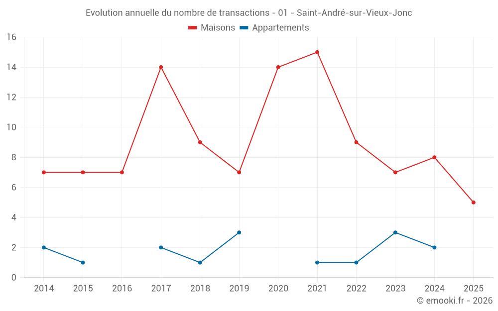 Le prix médian sur les 16 transactions de maisons des 24 derniers mois dans la commune de Saint-André-sur-Vieux-Jonc était de 2 462 € par mètre carré pour une valeur foncière médiane de 246 500 €. Sur cette période 60% des transactions se sont situées entre 1 811 et 2 717 € par mètre carré (du 2ème au 8ème déciles).