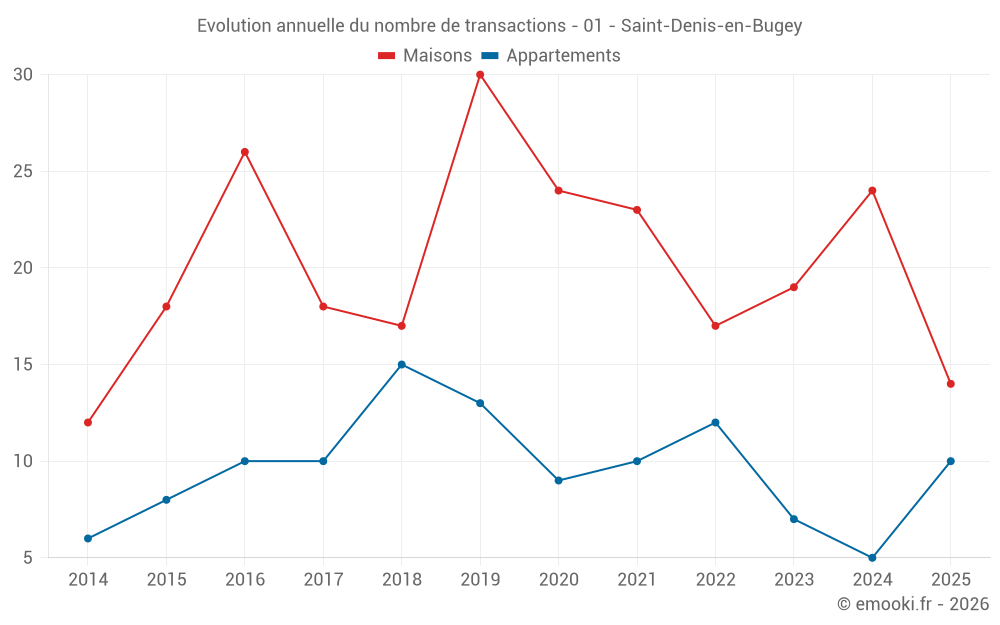 Le prix médian sur les 38 transactions de maisons des 24 derniers mois dans la commune de Saint-Denis-en-Bugey était de 2 138 € par mètre carré pour une valeur foncière médiane de 177 500 €. Sur cette période 60% des transactions se sont situées entre 1 339 et 2 716 € par mètre carré (du 2ème au 8ème déciles).