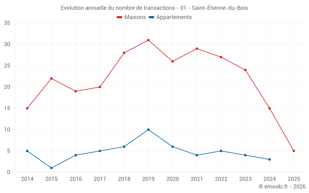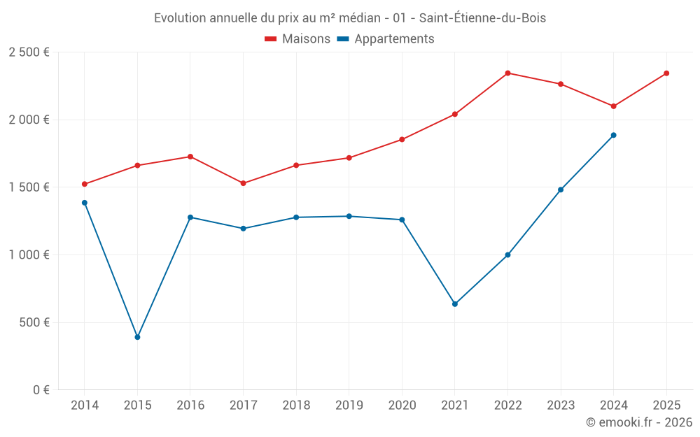 Le prix médian sur les 33 transactions de maisons des 24 derniers mois dans la commune de Saint-Étienne-du-Bois était de 2 238 € par mètre carré pour une valeur foncière médiane de 199 000 €. Sur cette période 60% des transactions se sont situées entre 1 667 et 2 606 € par mètre carré (du 2ème au 8ème déciles).