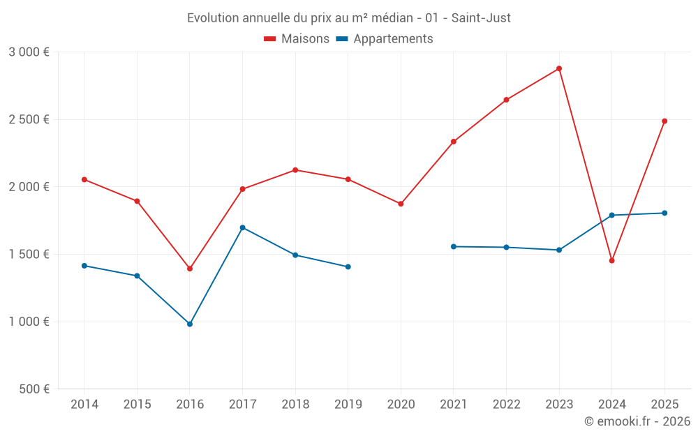 Le prix médian sur les 20 transactions de maisons des 12 derniers mois dans la commune de Saint-Just était de 2 488 € par mètre carré pour une valeur foncière médiane de 290 000 €. Sur cette période 60% des transactions se sont situées entre 2 024 et 2 879 € par mètre carré (du 2ème au 8ème déciles).