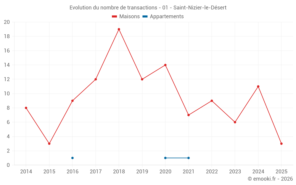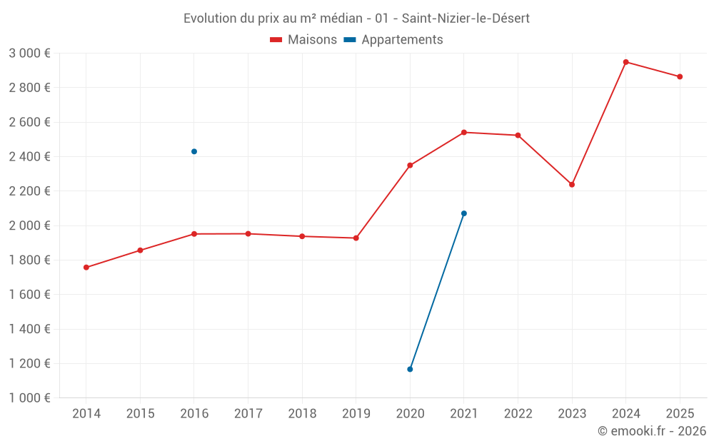 Le prix médian sur les 17 transactions de maisons des 24 derniers mois dans la commune de Saint-Nizier-le-Désert était de 2 864 € par mètre carré pour une valeur foncière médiane de 305 000 €. Sur cette période 60% des transactions se sont situées entre 2 034 et 3 186 € par mètre carré (du 2ème au 8ème déciles).
