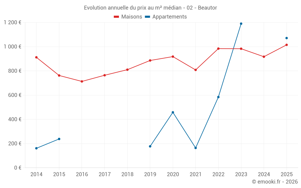 Le prix médian sur les 18 transactions de maisons des 12 derniers mois dans la commune de Beautor était de 1 015 € par mètre carré pour une valeur foncière médiane de 93 500 €. Sur cette période 60% des transactions se sont situées entre 747 et 1 388 € par mètre carré (du 2ème au 8ème déciles).