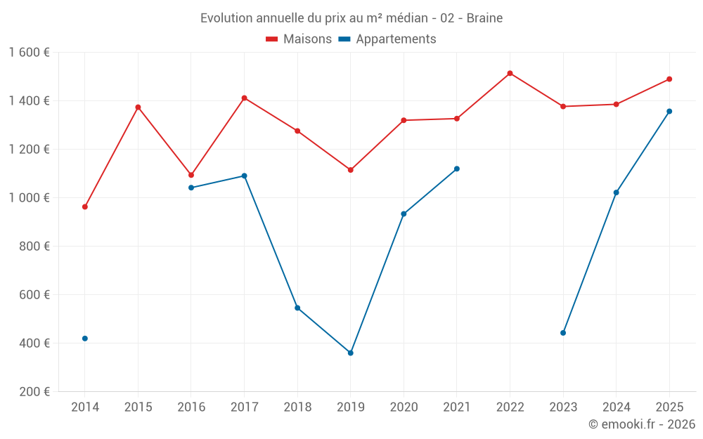 Le prix médian sur les 22 transactions de maisons des 12 derniers mois dans la commune de Braine était de 1 493 € par mètre carré pour une valeur foncière médiane de 136 500 €. Sur cette période 60% des transactions se sont situées entre 1 167 et 1 658 € par mètre carré (du 2ème au 8ème déciles).