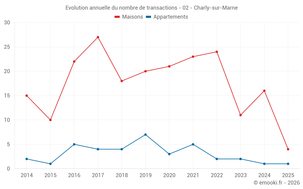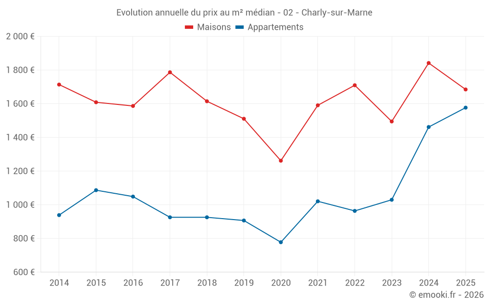 Le prix médian sur les 26 transactions de maisons des 24 derniers mois dans la commune de Charly-sur-Marne était de 1 701 € par mètre carré pour une valeur foncière médiane de 162 000 €. Sur cette période 60% des transactions se sont situées entre 1 250 et 2 279 € par mètre carré (du 2ème au 8ème déciles).
