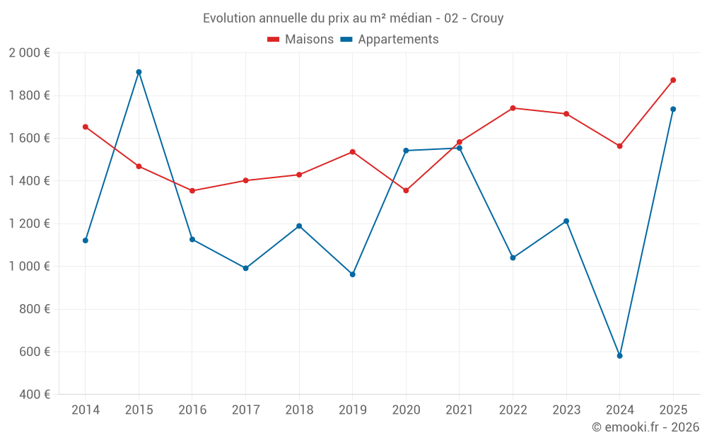 Le prix médian sur les 28 transactions de maisons des 12 derniers mois dans la commune de Crouy était de 1 872 € par mètre carré pour une valeur foncière médiane de 145 000 €. Sur cette période 60% des transactions se sont situées entre 1 364 et 2 216 € par mètre carré (du 2ème au 8ème déciles).