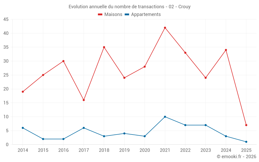 Le prix médian sur les 27 transactions de maisons des 12 derniers mois dans la commune de Crouy était de 1 680 € par mètre carré pour une valeur foncière médiane de 127 000 €. Sur cette période 60% des transactions se sont situées entre 1 265 et 1 960 € par mètre carré (du 2ème au 8ème déciles).