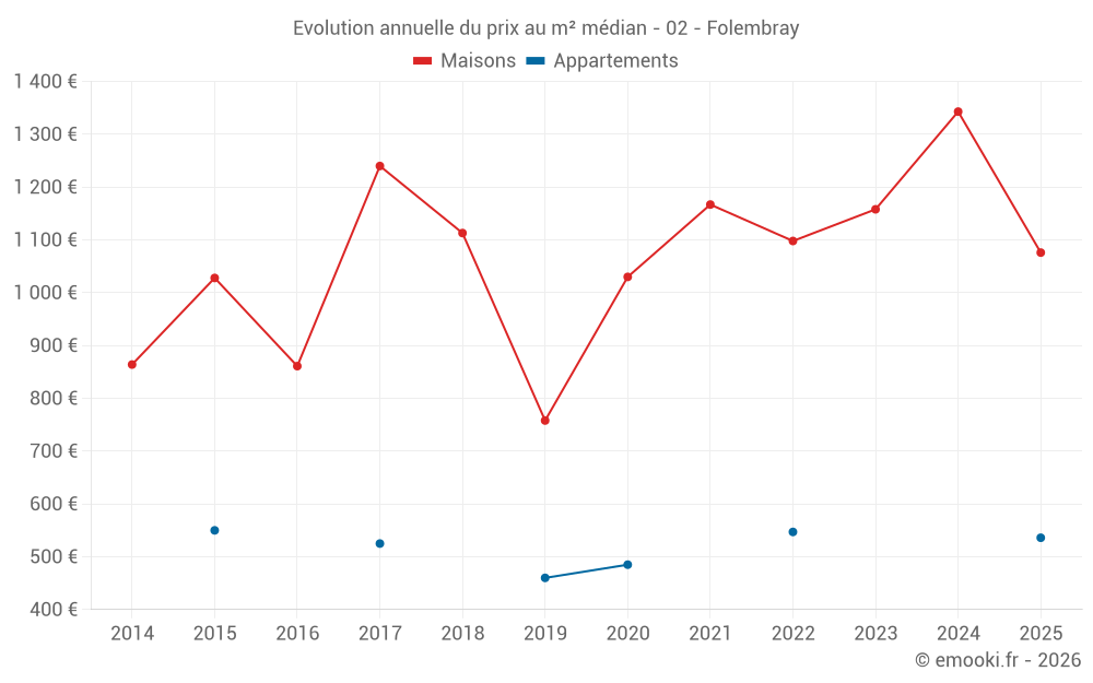 Le prix médian sur les 30 transactions de maisons des 24 derniers mois dans la commune de Folembray était de 1 176 € par mètre carré pour une valeur foncière médiane de 94 500 €. Sur cette période 60% des transactions se sont situées entre 993 et 1 448 € par mètre carré (du 2ème au 8ème déciles).