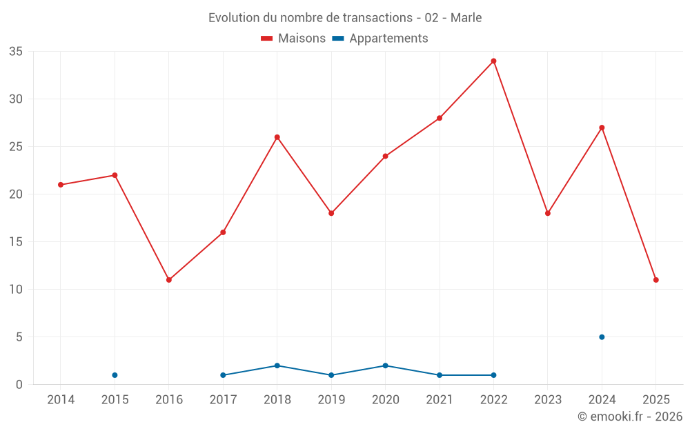 Le prix médian sur les 22 transactions de maisons des 12 derniers mois dans la commune de Marle était de 864 € par mètre carré pour une valeur foncière médiane de 70 000 €. Sur cette période 60% des transactions se sont situées entre 560 et 1 272 € par mètre carré (du 2ème au 8ème déciles).
