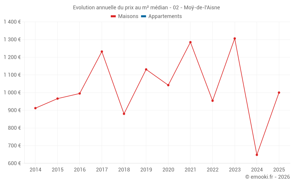 Le prix médian sur les 27 transactions de maisons des 24 derniers mois dans la commune de Moÿ-de-l'Aisne était de 943 € par mètre carré pour une valeur foncière médiane de 90 000 €. Sur cette période 60% des transactions se sont situées entre 446 et 1 513 € par mètre carré (du 2ème au 8ème déciles).