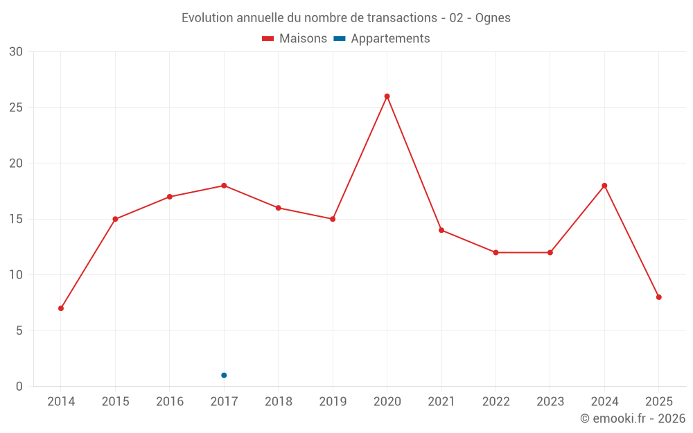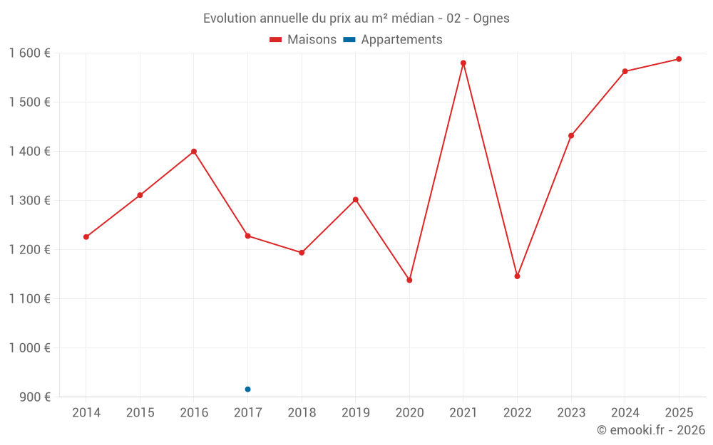 Le prix médian sur les 19 transactions de maisons des 12 derniers mois dans la commune d'Ognes était de 1 459 € par mètre carré pour une valeur foncière médiane de 115 000 €. Sur cette période 60% des transactions se sont situées entre 977 et 1 781 € par mètre carré (du 2ème au 8ème déciles).