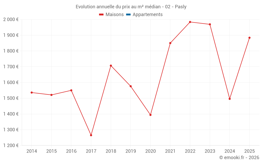 Le prix médian sur les 23 transactions de maisons des 24 derniers mois dans la commune de Pasly était de 1 796 € par mètre carré pour une valeur foncière médiane de 178 000 €. Sur cette période 60% des transactions se sont situées entre 1 400 et 2 039 € par mètre carré (du 2ème au 8ème déciles).