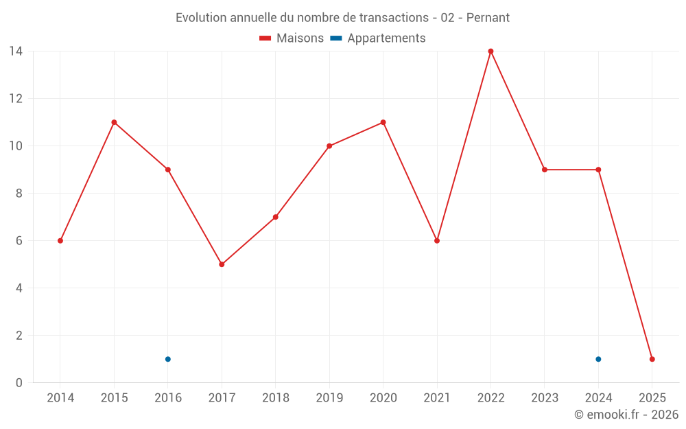 Le prix médian sur les 17 transactions de maisons des 24 derniers mois dans la commune de Pernant était de 1 667 € par mètre carré pour une valeur foncière médiane de 150 000 €. Sur cette période 60% des transactions se sont situées entre 1 433 et 2 330 € par mètre carré (du 2ème au 8ème déciles).