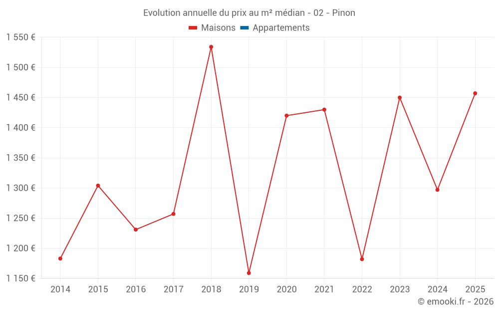 Le prix médian sur les 31 transactions de maisons des 24 derniers mois dans la commune de Pinon était de 1 386 € par mètre carré pour une valeur foncière médiane de 102 000 €. Sur cette période 60% des transactions se sont situées entre 1 215 et 1 714 € par mètre carré (du 2ème au 8ème déciles).