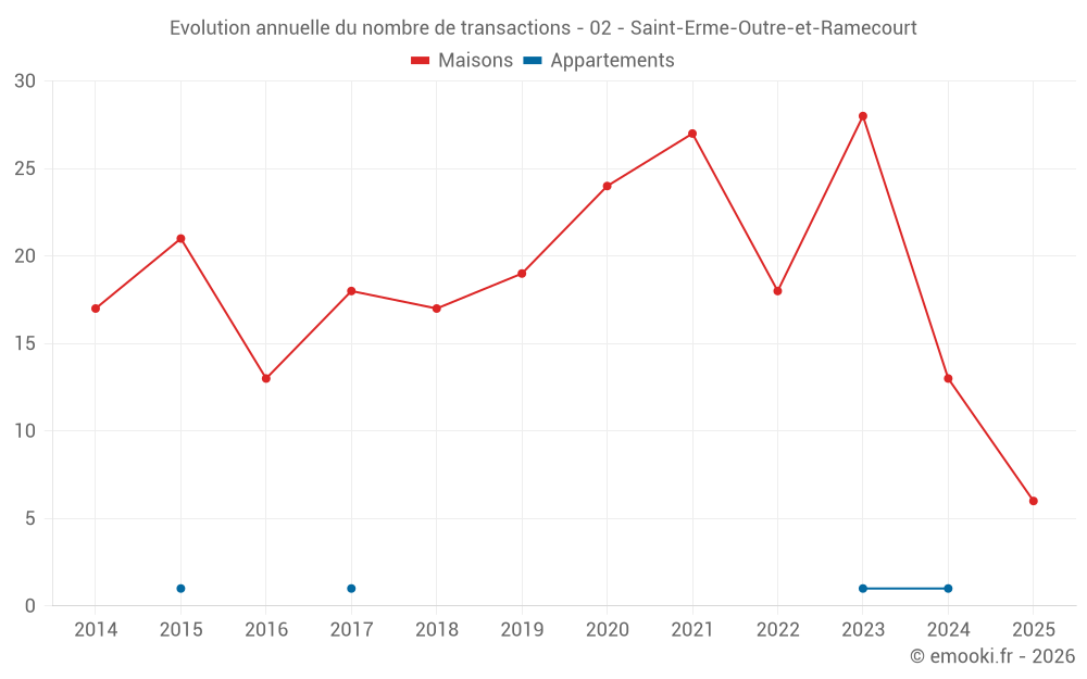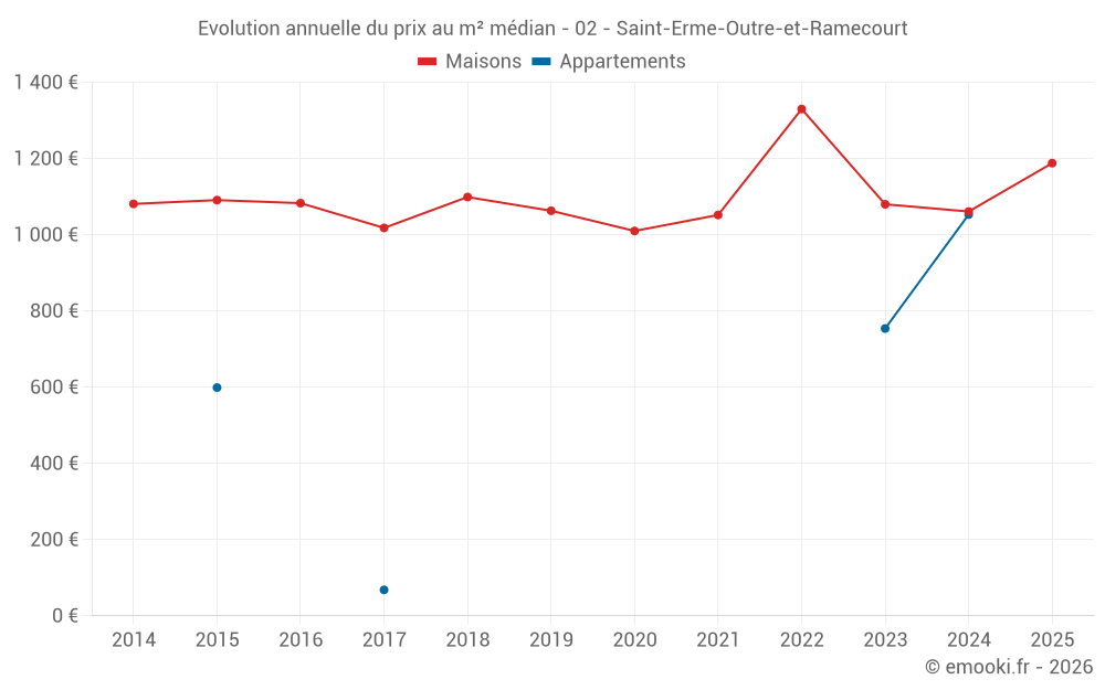 Le prix médian sur les 34 transactions de maisons des 24 derniers mois dans la commune de Saint-Erme-Outre-et-Ramecourt était de 1 109 € par mètre carré pour une valeur foncière médiane de 117 475 €. Sur cette période 60% des transactions se sont situées entre 622 et 1 495 € par mètre carré (du 2ème au 8ème déciles).
