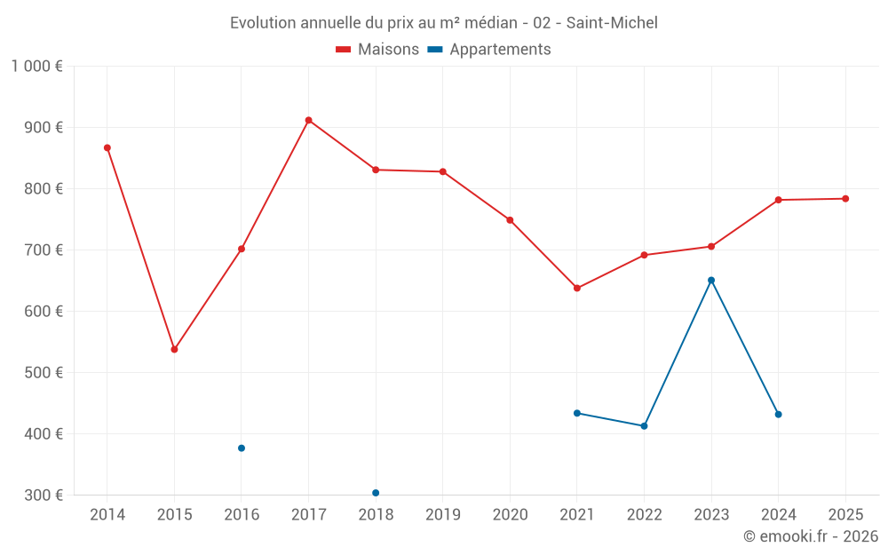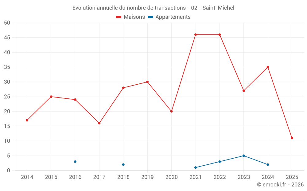 Le prix médian sur les 33 transactions de maisons des 12 derniers mois dans la commune de Saint-Michel était de 850 € par mètre carré pour une valeur foncière médiane de 85 000 €. Sur cette période 60% des transactions se sont situées entre 445 et 1 467 € par mètre carré (du 2ème au 8ème déciles).