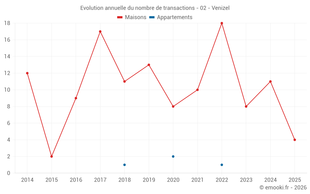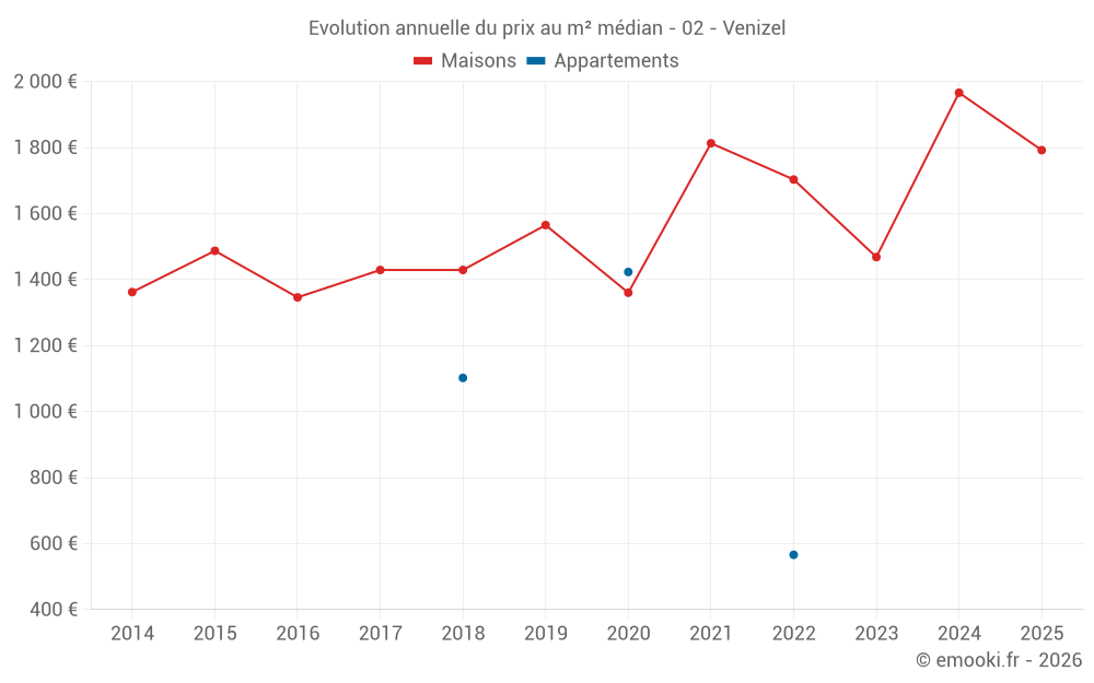 Le prix médian sur les 20 transactions de maisons des 24 derniers mois dans la commune de Venizel était de 1 769 € par mètre carré pour une valeur foncière médiane de 134 960 €. Sur cette période 60% des transactions se sont situées entre 1 424 et 2 075 € par mètre carré (du 2ème au 8ème déciles).