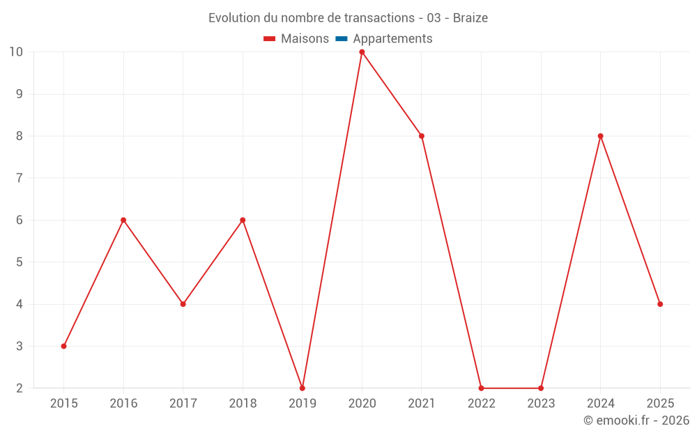 Le prix médian sur les 14 transactions de maisons des 24 derniers mois dans la commune de Braize était de 908 € par mètre carré pour une valeur foncière médiane de 71 000 €. Sur cette période 60% des transactions se sont situées entre 615 et 1 406 € par mètre carré (du 2ème au 8ème déciles).