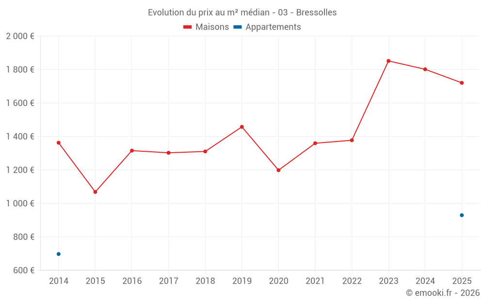 Le prix médian sur les 15 transactions de maisons des 24 derniers mois dans la commune de Bressolles était de 1 842 € par mètre carré pour une valeur foncière médiane de 155 000 €. Sur cette période 60% des transactions se sont situées entre 1 184 et 2 071 € par mètre carré (du 2ème au 8ème déciles).