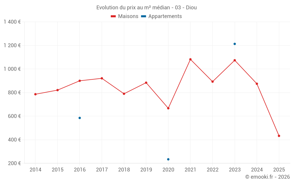 Le prix médian sur les 22 transactions de maisons des 24 derniers mois dans la commune de Diou était de 904 € par mètre carré pour une valeur foncière médiane de 71 250 €. Sur cette période 60% des transactions se sont situées entre 446 et 1 230 € par mètre carré (du 2ème au 8ème déciles).