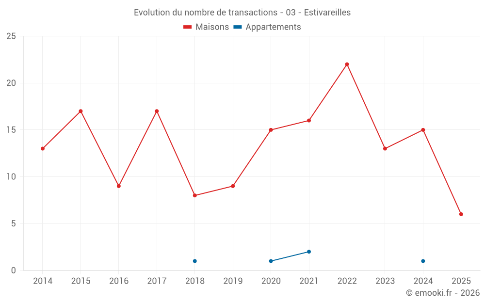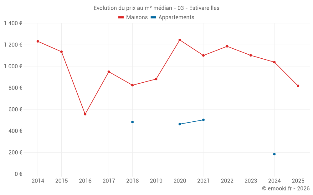 Le prix médian sur les 26 transactions de maisons des 24 derniers mois dans la commune d'Estivareilles était de 1 042 € par mètre carré pour une valeur foncière médiane de 85 000 €. Sur cette période 60% des transactions se sont situées entre 647 et 1 333 € par mètre carré (du 2ème au 8ème déciles).