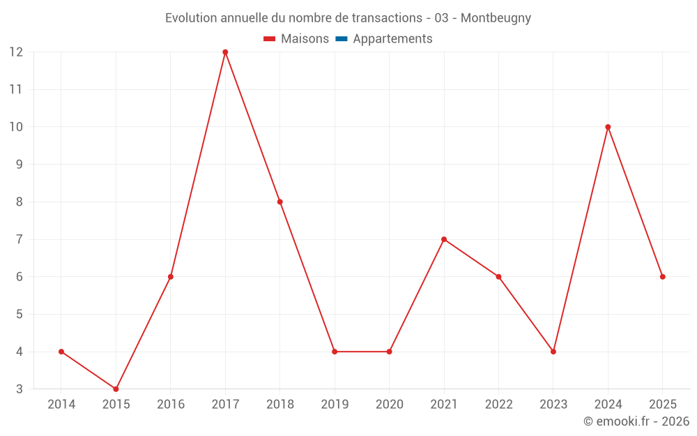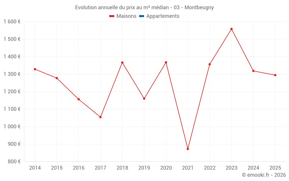 Le prix médian sur les 18 transactions de maisons des 24 derniers mois dans la commune de Montbeugny était de 1 318 € par mètre carré pour une valeur foncière médiane de 122 562 €. Sur cette période 60% des transactions se sont situées entre 879 et 1 794 € par mètre carré (du 2ème au 8ème déciles).