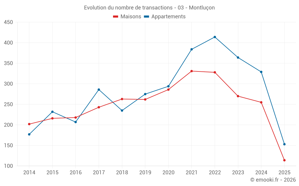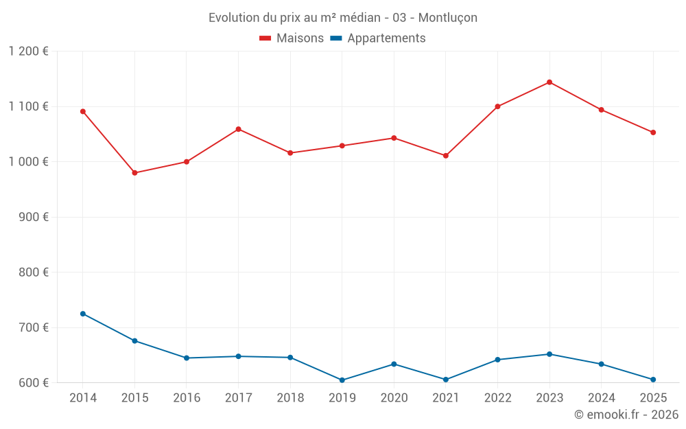 Le prix médian sur les 50 transactions de maisons des 3 derniers mois dans la commune de Montluçon était de 1 018 € par mètre carré pour une valeur foncière médiane de 90 800 €. Sur cette période 60% des transactions se sont situées entre 610 et 1 461 € par mètre carré (du 2ème au 8ème déciles).