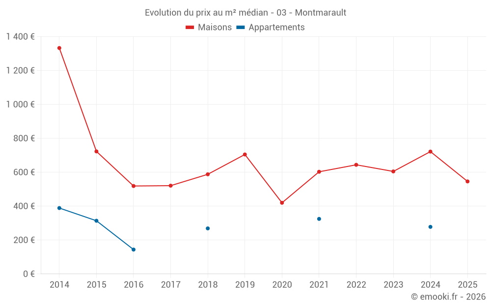 Le prix médian sur les 19 transactions de maisons des 12 derniers mois dans la commune de Montmarault était de 676 € par mètre carré pour une valeur foncière médiane de 64 000 €. Sur cette période 60% des transactions se sont situées entre 516 et 1 020 € par mètre carré (du 2ème au 8ème déciles).