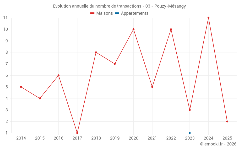 Le prix médian sur les 14 transactions de maisons des 24 derniers mois dans la commune de Pouzy-Mésangy était de 852 € par mètre carré pour une valeur foncière médiane de 85 000 €. Sur cette période 60% des transactions se sont situées entre 430 et 1 200 € par mètre carré (du 2ème au 8ème déciles).