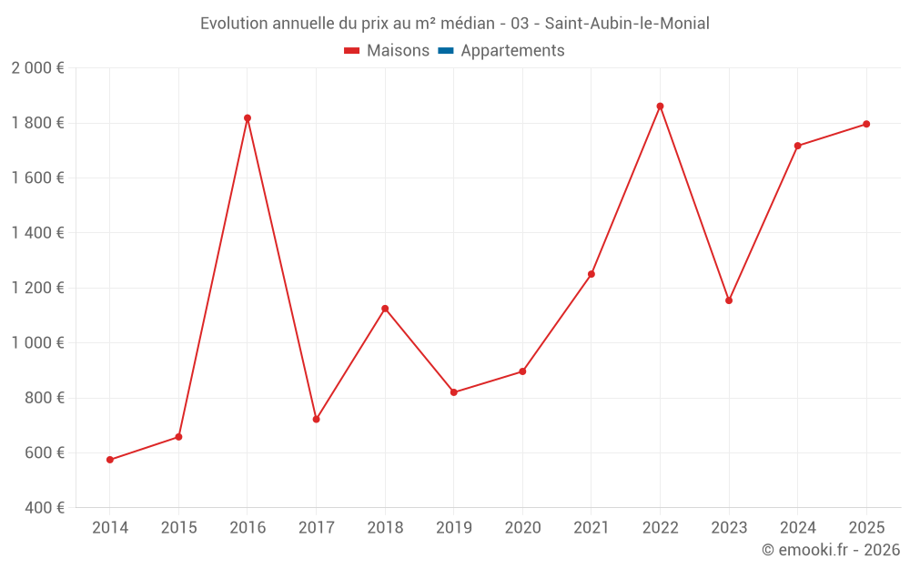 Le prix au m² des maisons a augmenté de 56% depuis 2 ans, mais il a diminué de 3.5% en 3 ans.