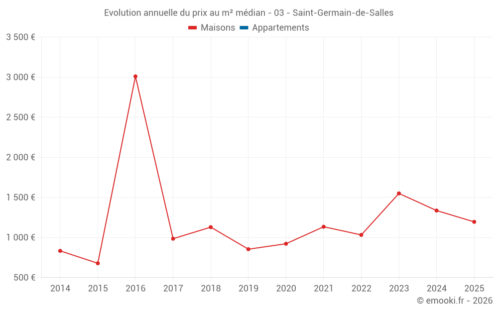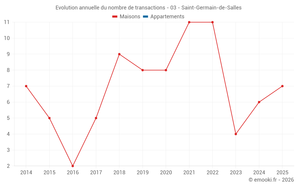Le prix médian sur les 15 transactions de maisons des 24 derniers mois dans la commune de Saint-Germain-de-Salles était de 1 281 € par mètre carré pour une valeur foncière médiane de 119 320 €. Sur cette période 60% des transactions se sont situées entre 879 et 1 844 € par mètre carré (du 2ème au 8ème déciles).