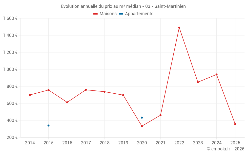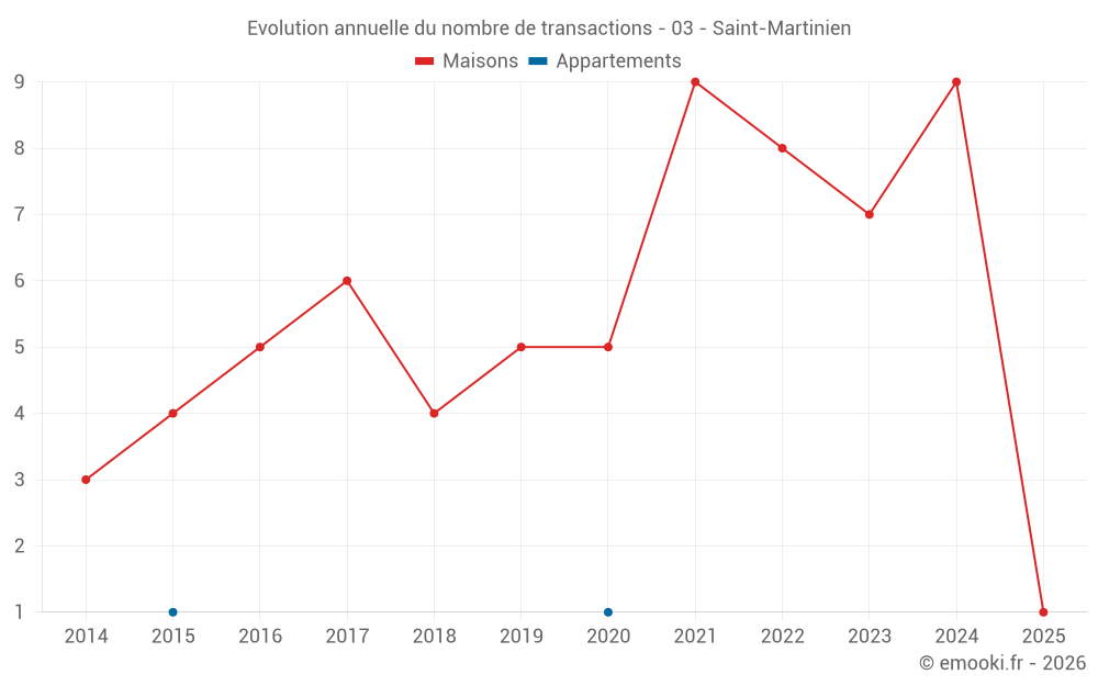 Le prix médian sur les 17 transactions de maisons des 24 derniers mois dans la commune de Saint-Martinien était de 850 € par mètre carré pour une valeur foncière médiane de 68 000 €. Sur cette période 60% des transactions se sont situées entre 430 et 1 105 € par mètre carré (du 2ème au 8ème déciles).