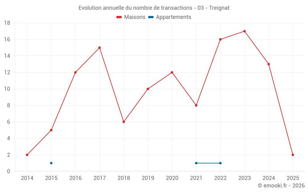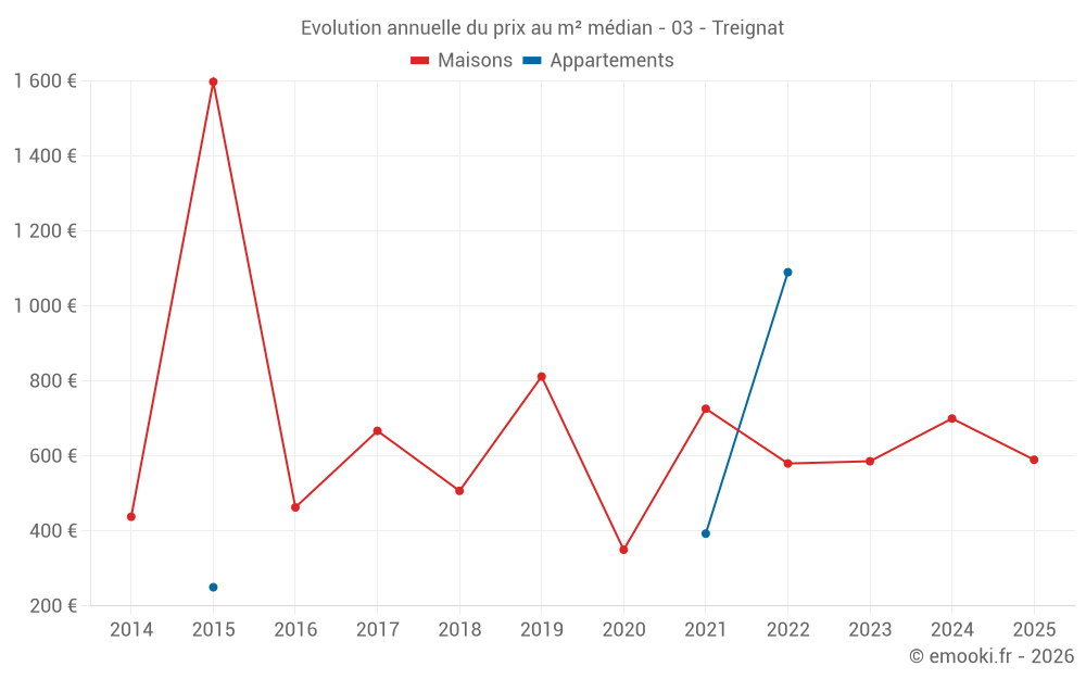 Le prix médian sur les 29 transactions de maisons des 24 derniers mois dans la commune de Treignat était de 586 € par mètre carré pour une valeur foncière médiane de 65 000 €. Sur cette période 60% des transactions se sont situées entre 304 et 1 097 € par mètre carré (du 2ème au 8ème déciles).