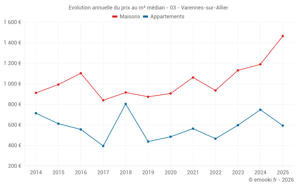 Le prix médian sur les 28 transactions d'appartements des 24 derniers mois dans la commune de Varennes-sur-Allier était de 652 € par mètre carré pour une valeur foncière médiane de 43 500 €. Sur cette période 60% des transactions se sont situées entre 475 et 936 € par mètre carré (du 2ème au 8ème déciles).